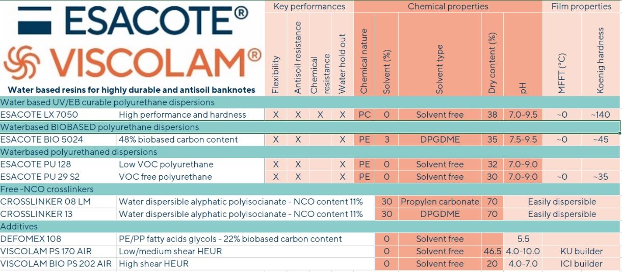 ESACOTE® is our brand of waterborne synthetic polymers. They are primary building blocks for developing surface treatments with excellent flexibility and chemical resistances. Thanks to their peculiar set of performance, it is possible to enhance remarkably durability and soil resistance of banknotes, providing the papermakers solutions for optimizing technical performance and maximizing sustainability.